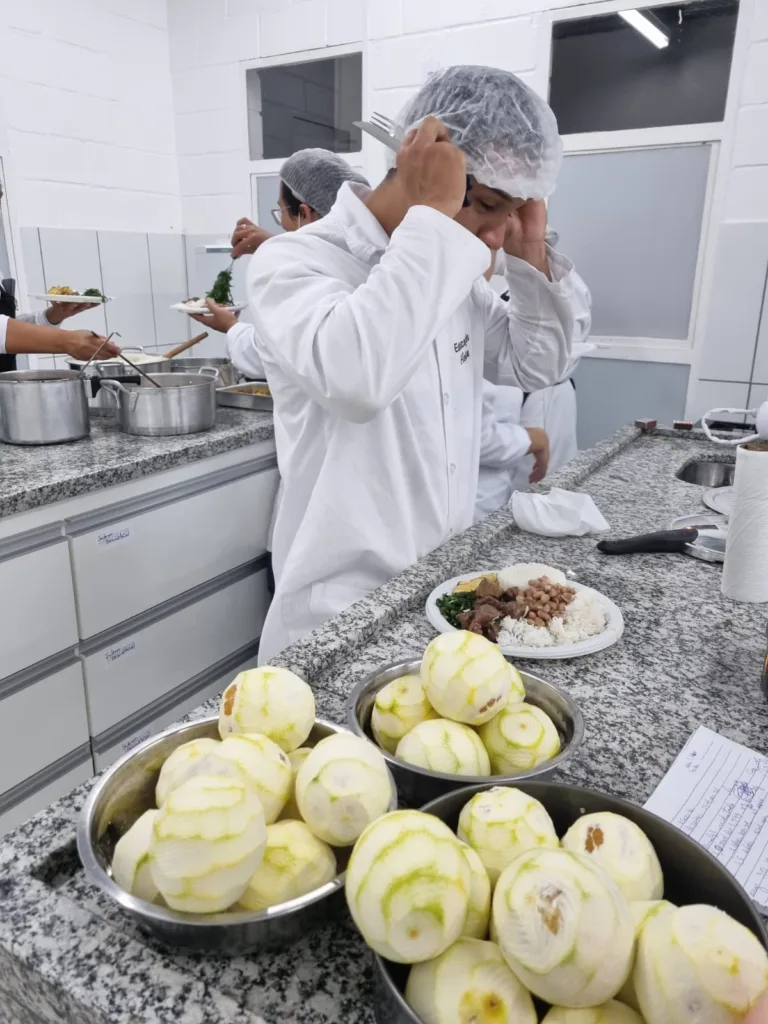 A carne e as hortaliças também foram protagonistas durante a aula prática. Os estudantes aprenderam sobre a seleção adequada dos cortes de carne e a forma correta de cozinhá-los para preservar seus nutrientes. Já com as hortaliças, eles exploraram diferentes métodos de preparo, como o cozimento no vapor, que mantém a textura crocante e preserva as vitaminas e minerais.